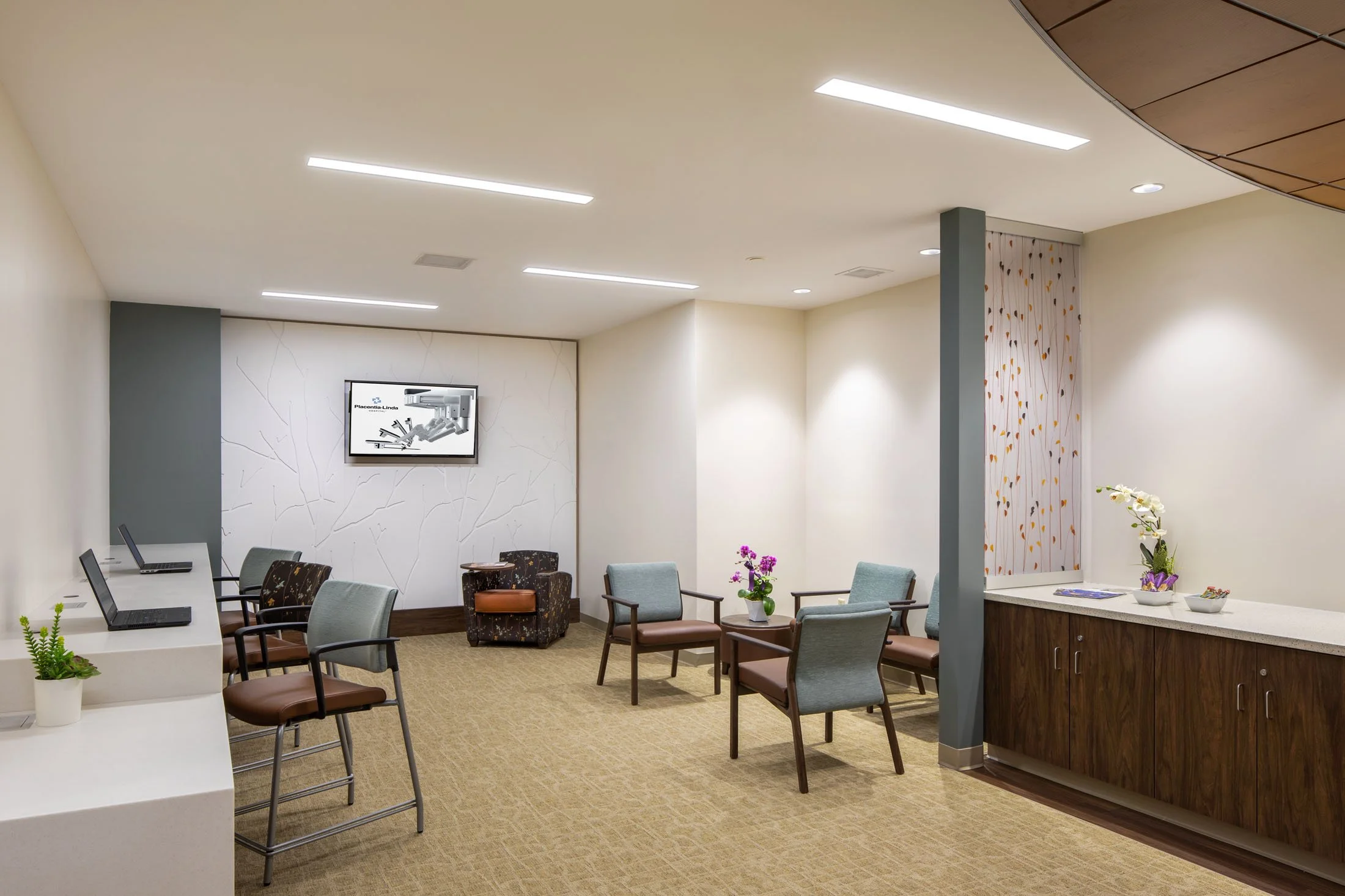 c|a architects reworked an existing administration area to create a spacious, family-friendly waiting area, an efficient Cath Lab with two holding/PACU beds, a four-bed PACU area, and updated staff spaces. The new suite offers a warm finish palette that reinforces the hospital’s existing interior standards. In the reception and waiting area, cool tones and soothing, nature inspired patterns and textures add energy and visual interest with a nourishment bar and a variety of seating options to support the comfort and needs of waiting family members. The design team collaborated with the hospital and GE Healthcare for the extensive planning of the Cath Lab. Versatile storage on the perimeter with adjustable peg boards for catheters create an efficient workspace within the new lab.